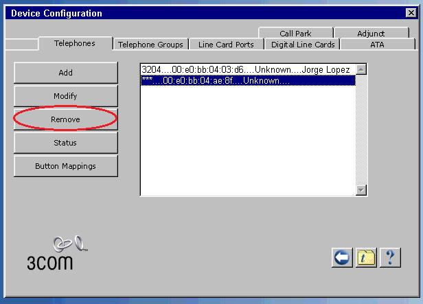 3. In the Device Configuration / Telephones window, select the telephone to be replaced and click Remove. At this time, the phone to be replaced does not have an extension, instead it has 4 asterisks.